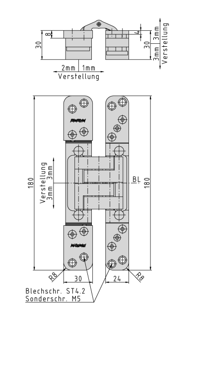 Concealed hinge for non-rebated doors, hinge leaves are mortised into frame and door; 3-dimensional adjustability, maintenance-free bearings; frame part provided with screenAccessories: